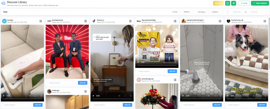 Leveraging our robust AI algorithms, we diligently curate high-quality advertisements daily across various platforms. In Denote's Ad Library, you can easily find the creative inspiration you're looking for. With a simple 'Save' action, you have the convenience of storing these creative gems in your personal space. Moreover, we offer an array of filtering options to streamline your search for the perfect creative. You can narrow down your choices by platform, type of advertisement, and current deployment status, among other criteria. Dive into the Denote Ad Library experience today, and enjoy a discovery process that's truly unique.