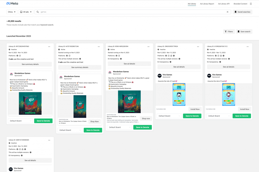 By following either of these options, you can save your Facebook ad inspiration to Denote. Additionally, Denote will also save other details from Facebook, including the Facebook ad copy, display format (vertical or horizontal), Facebook campaign objective, and advertising industry.